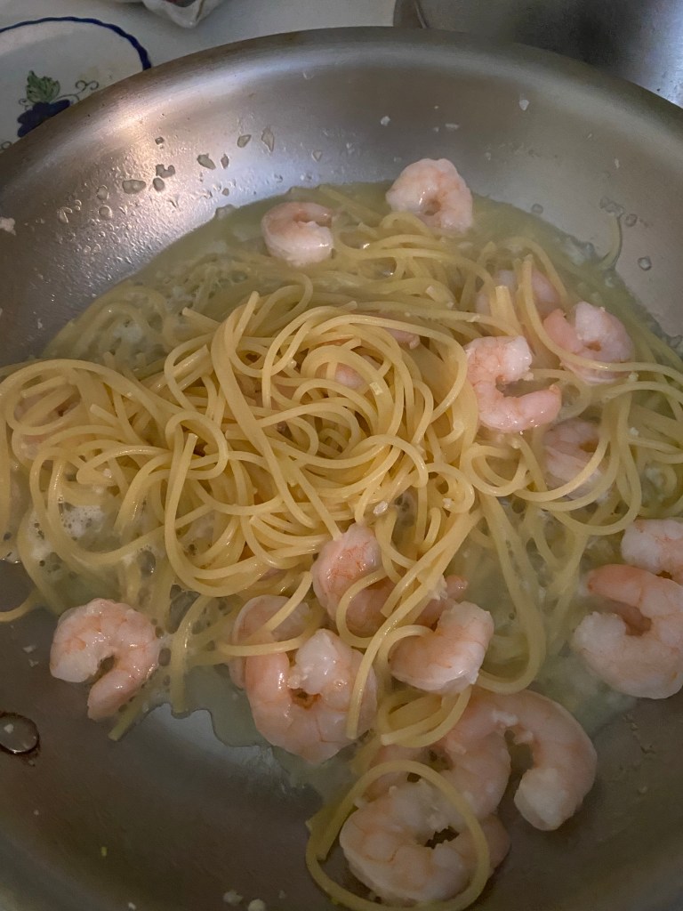 In a large pot bring the water to a boil and add your pasta of choice. While that is cooking you will need a large skillet for the sauce and shrimp. Melt the butter in your skillet over medium heat. Add the garlic, butter and lemon juice and stir frequently for about 2 min. Add the shrimp and season it with salt and ground pepper and cook until the shrimp is pinkish color. Stir in your pasta of choice and you’re done.