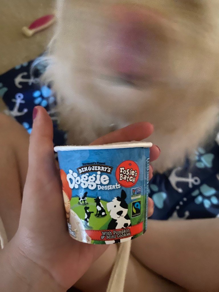 I recently bought these ice cream cups from pet co. .. I found them pretty funny. Jasper likes them so I might buy them again next summer… they are pumpkin flavored and just for dogs.